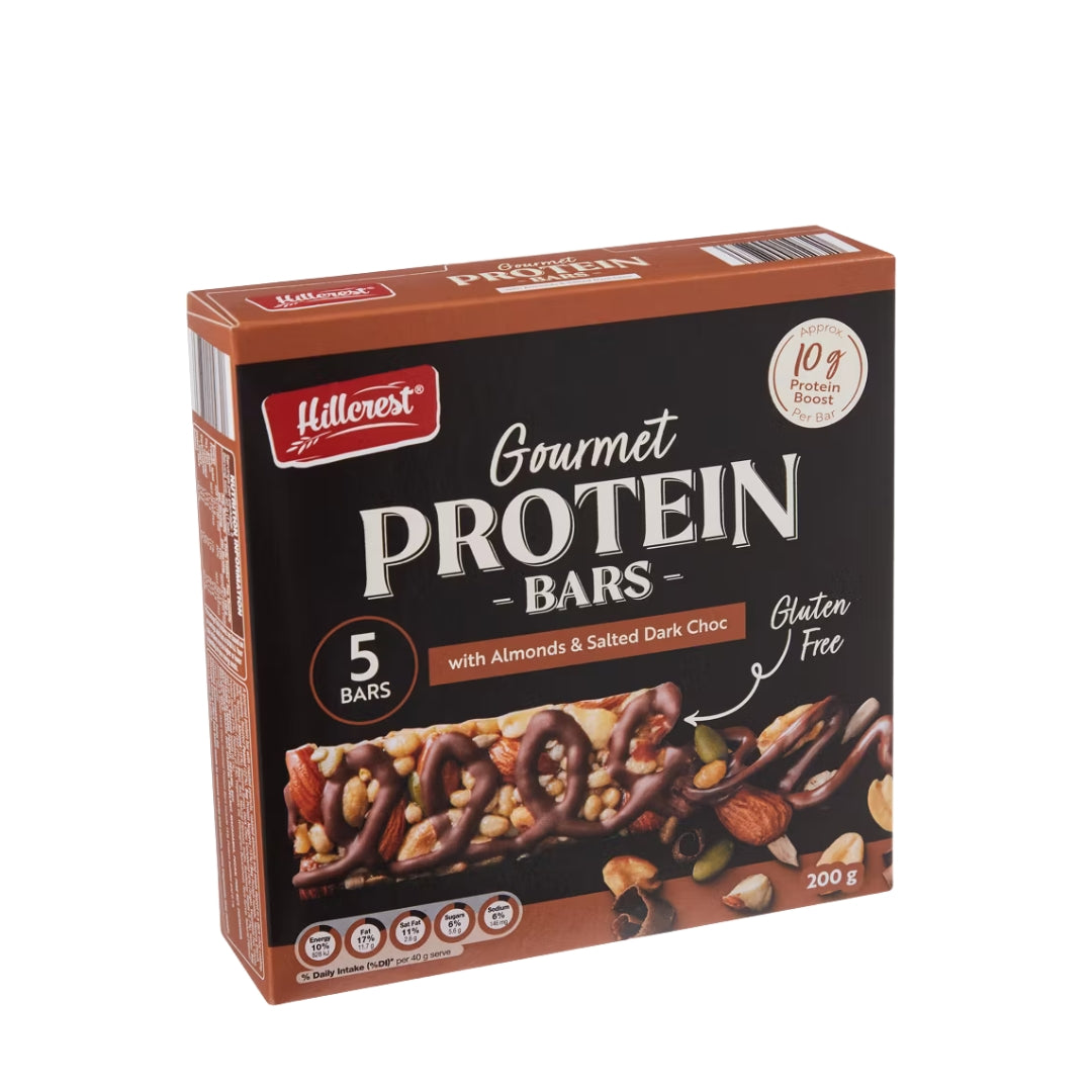Five gourmet protein bars with almond and salted dark chocolate — a rich, satisfying snack that fuels your day, perfect for school lunchboxes, office breaks, workouts, or on‑the‑go energy.